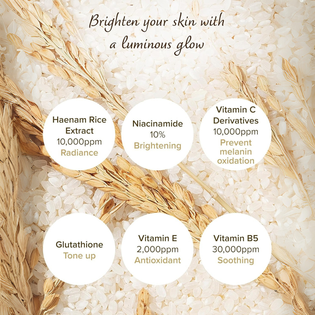 - Contains 10,000ppm of organic Hiami rice extract from Haenam, Korea, which supplies skin nutrition, and 30,000ppm of panthenol to aid in soothing and moisturizing, making it a daily whitening serum that can be used even on sensitive skin without irritation.