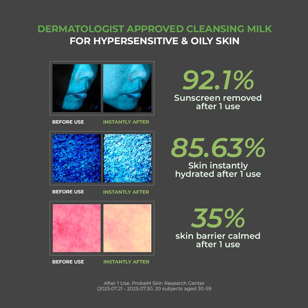 A soothing cleansing milk infused with Dexpanthenol and Azulene to calm irritation and redness and prevent dryness, while removing sunscreen and everyday makeup without stripping skin.